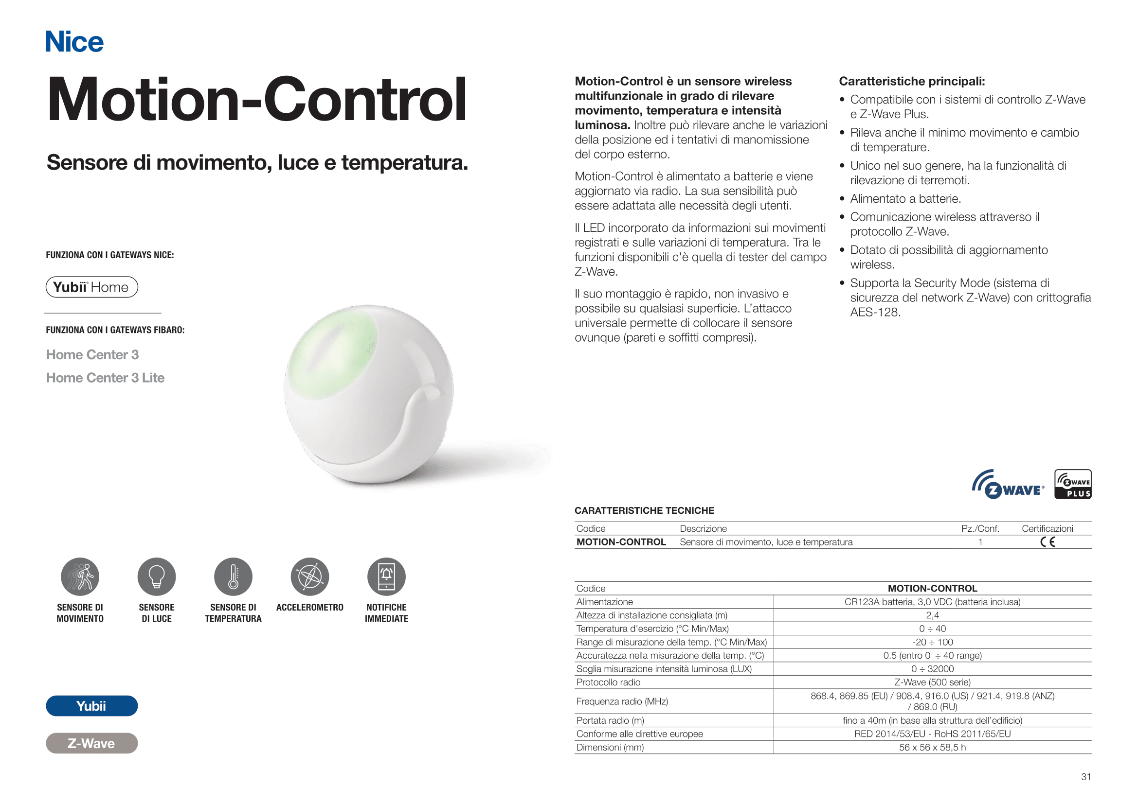 Motion-Control è un sensore wireless multifunzionale in grado di rilevare movimento, temperatura e intensità luminosa. Inoltre può rilevare anche le variazioni della posizione ed i tentativi di manomissione del corpo esterno.